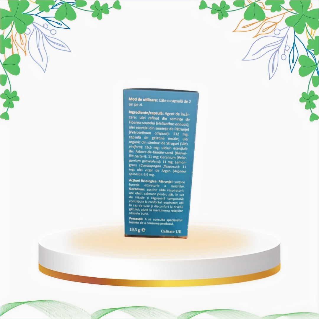 Agent de incarcare: ulei rafinat din seminte de Floarea-soarelui (Helianthus annuus); ulei esential din seminte de Patrunjel (Petroselinum crispum): 132 mg; capsula moale de gelatina; ulei organic din samburi de Struguri (Vitis vinifera): 16,5 mg; uleiuri esentiale de: Arbore-de-tamaie–sacra (Boswellia carteri): 11 mg; Geranium (Pelargonium graveolens): 11 mg; Lemongrass (Cymbopogon flexuosus): 11 mg; ulei virgin de Argan (Argania spinosa): 6,6 mg.