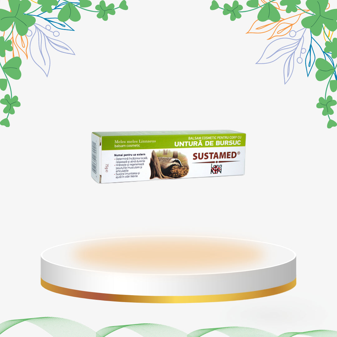 Balsamul „Sustamed” cu untura de bursuc este un mijloc sigur și eficient pentru diminuarea tensiunii musculare, a durerilor si umflaturilor si a pentru redarea mobilitatii si flexibilitatii articulatiilor afectate de procesele inflamatorii. Preparatul stimulează microcirculația, promovează regenerarea tesuturilor cartilaginoase, are efect calmant, nutritiv si regenerator la nivelul articulațiilor și zonelor periarticulare. Balsamul are efect de încălzire ușoară si poate actiona eficient in caz de raceala prin reducerea temperaturii corpului.